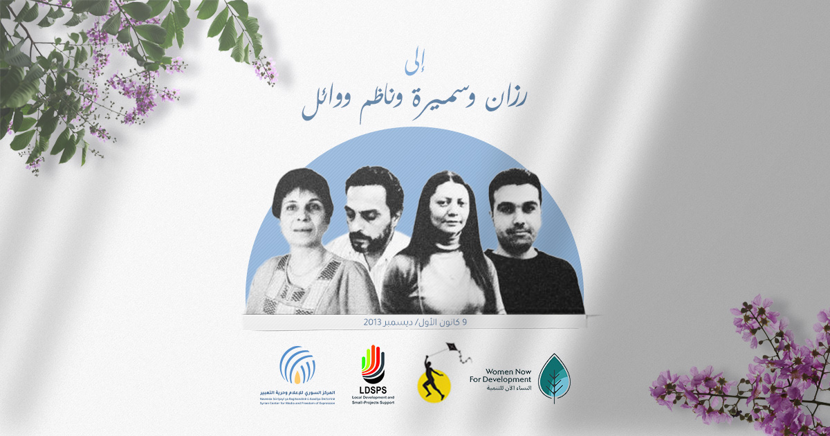 We feel your absence every day, we search for your tenacity and determination; you who did not save time and did not leave a problem without finding a solution to it. Many of the works were born from the womb of the Local Coordination Committees, which you helped establish; Institutions specialized in the development, relief, human rights, media, and advocacy, all of which derive their messages from the vision that you believed in and represented. Until today, we are unable to know your fate, but as always, we spare no effort in seeking to unveil the truth and hold those who kidnapped you accountable. Today, one of those involved in your kidnapping is imprisoned in France while awaiting for the French judiciary to say its word and prosecute him. We had hoped that today we would reach the possibility of holding the perpetrators accountable before a fair, independent, and impartial judiciary in our own beloved country, whose freedom and democracy we all dreamt of, but we know that what is happening now are steps on the long path to justice. We have evidence and testimonies proving the crime of kidnapping you, Razan, Nazem, and Samira. Both us and your families are seeking to find out your whereabouts and free you. This is only one of many steps that we will continue to take until the perpetrators of such violations are punished and we reunite again.
