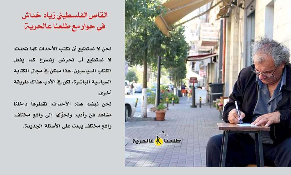 الكاتب والمعلم زياد خداش الذي ولد في القدس عام 1964، ويحمل إجازة في الأدب العربي من جامعة اليرموك، يمارس التعليم في مدارس فلسطين ويدرّس الكتابة الإبداعيّة، في رصيده اثنتا عشر مجموعة قصصيّة، حائز على جائزة فلسطين التشجيعية عن كتابه “خطأ النادل”.