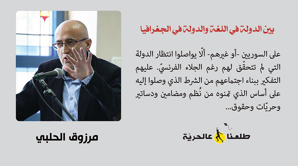 على السوريين -أو غيرهم- ألّا يواصلون انتظار الدولة التي لم تتحقّق لهم رغم الجلاء الفرنسيّ. عليهم التفكير ببناء اجتماعهم من الشرط الذي وصلوا إليه على أساس الذي تمنوه من نُظم ومضامين ودساتير وحريّات وحقوق. صحيح أن للدولة دورها الأساس في بناء الاجتماع، لكن في غيابها -وحيث استطاع الناس أن يفعلوا- على القوى الفاعلة أن تُنظّم الاجتماع، وتقوم بأوده ريثما يكبر ويكتسب مناعة.