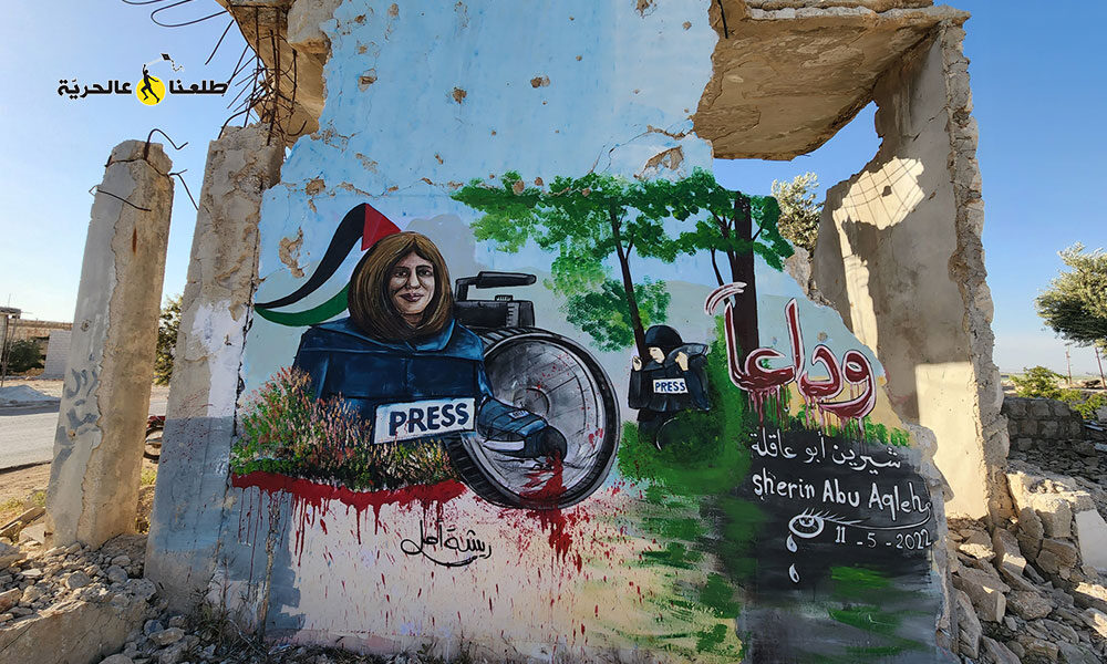 الجدارية نفذها الفنان عزيز الأسمر إهداءً للصحفية الفلسطينية شيرين أبو عاقلة وللقضية الفلسطينية، وقد تم رسمها على أحد الجدران التي دمرت بفعل قصف قوات النظام على مدينة بنش بريف ادلب، وذلك تعبيراً عن وحدة القضية في سوريا وفلسطين واعدائها المشتركين.