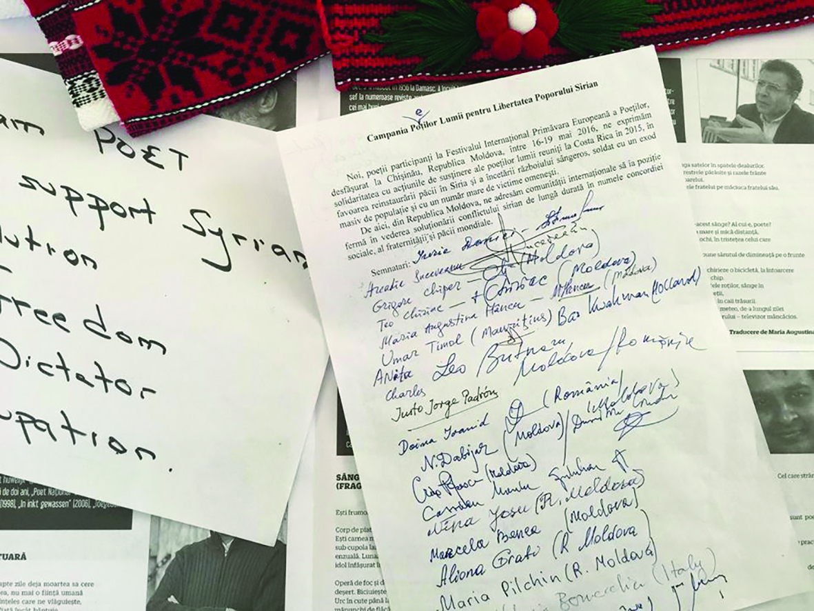 أطلق عدد من الشعراء والشاعرات حول العالم، من المشاركين بالمهرجان الدولي للشعر والربيع في العاصمة المولدوفية تشيناوا مايو/أيار 2016، بيانا تضامنيا مع الشعب السوري، وهو بحسب تصريح شاعر الأوديسة السورية نوري الجراح المشارك بفعاليات المهرجان، “المحطة الثانية في رحلة بيان شعراء العالم المتضامنين مع نضال الشعب السوري ضد نظام الاسد والاحتلال الروسي/الإيراني الذي انطلق من القارة اللاتينية”.