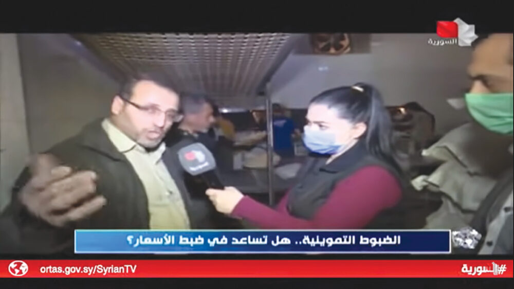 تقف المذيعة داخل أحد الأفران الآلية المؤسسة في سبعينيات القرن الماضي في سوريا، وترى بين الأيدي المتدافعة من الشباك الصغير يداً لطفل تحمل أربع بطاقات تتيح كل منها ربطة خبز واحدة للعائلة يومياً لا تصل إلى كيلوغرام واحد، فتنفعل فجأة وتشير إلى الكاميرا لتقترب من وجهه الذي يمتقع وهي تنهره قائلة “لا تغطيها بالطاقية”، فيقول المسؤول بجانبها “ممنوع أكثر من بطاقتين في الدور للشخص”، ثم يتحدث آخر عن “مخالفة إدارية” وضرورة تنظيم “ضبط” في ذلك، فترد عليه “إنشالله تكون العقوبة رادعة”.