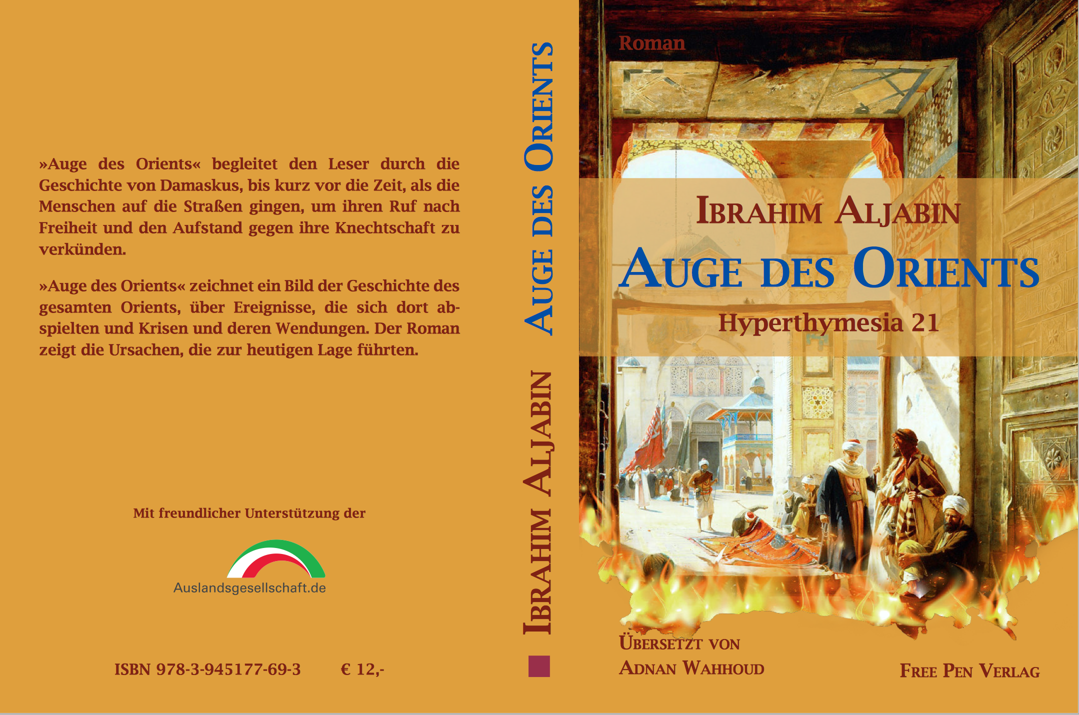 عن دار نشر Free Pen Verlag في مدينة بون الألمانية، صدرت الطبعة الألمانية لرواية “عين الشرق” للكاتب والروائي السوري “إبراهيم الجبين“، في 375 صفحة من القطع المتوسط، من ترجمة العالم السوري الدكتور عدنان وحود. في حين حمل غلاف الرواية لوحة تعكس صورة من مدينة دمشق القديمة رسمها الألماني غوستاف باورنفايند في دمشق عام 1890.