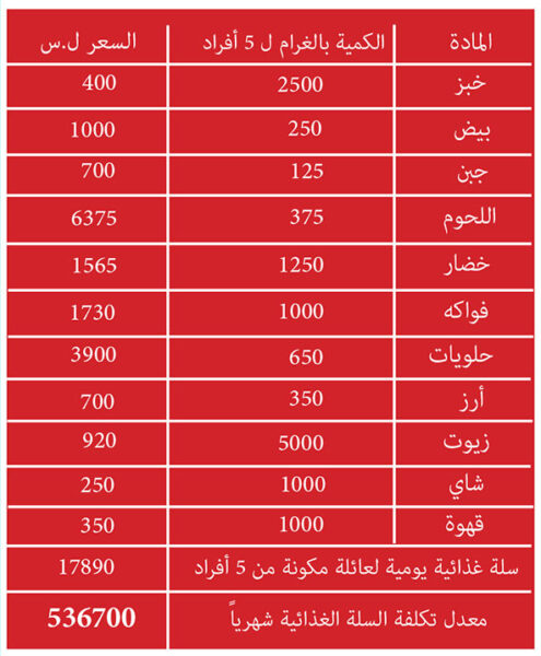 536700 ليرة سورية، متوسط تكلفة سلة غذائية شهرية لعائلة من خمسة أفراد