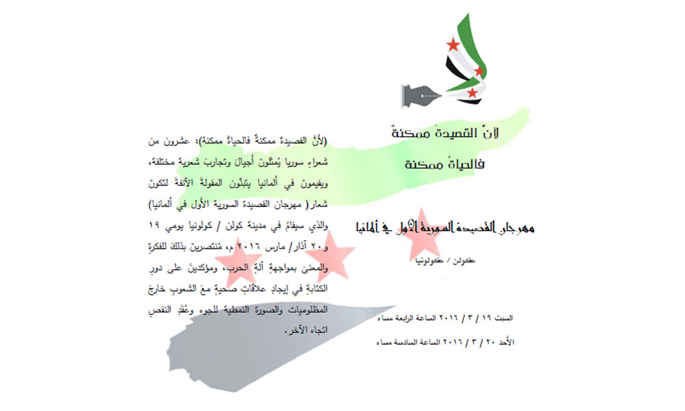 تشهد مدينة كولونيا الألمانية يومي 19 و20 مارس/آذار الجاري فعاليات “مهرجان القصيدة السورية الأول في ألمانيا” بمشاركة عشرين شاعرا سوريا من مختلف المدن الألمانية ويمثلون تجارب شعرية مختلفة، لكنهم وعلى اختلاف مشاربهم يجمعهم منفى واحد.