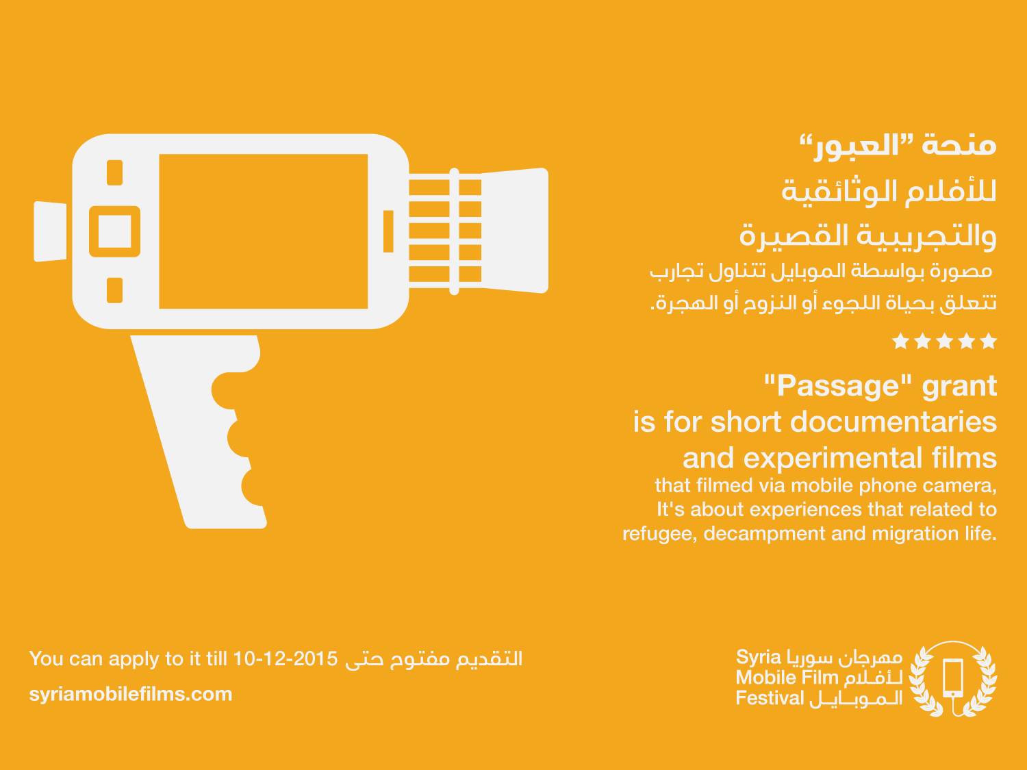 يُطلق مهرجان سوريا لأفلام الموبايل منحتين لدورته الثانية 2015-2016، المنحة الأولى “العبور” التي تقدم الفرصة للفنانين السوريين في مناطق اللجوء الداخلي والخارجي، لتقديم تجاربهم ونظرتهم عن حياة الهجرة واللجوء، باستخدام كاميرا الموبايل. أما المنحة الثّانية فهي “سوريا تيوب” التي يتوجه فيها إلى الفنانين الراغبين باستثمار مواد موقع اليوتيوب المصورة بواسطة الموبايل من سوريا.